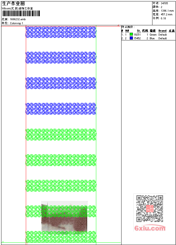 - emb花版参数: 大小:254.50 KB / 尺寸:457*1396[毫米] / 针数:34705针 / 线色:2 / 格式:emb / 版本:7