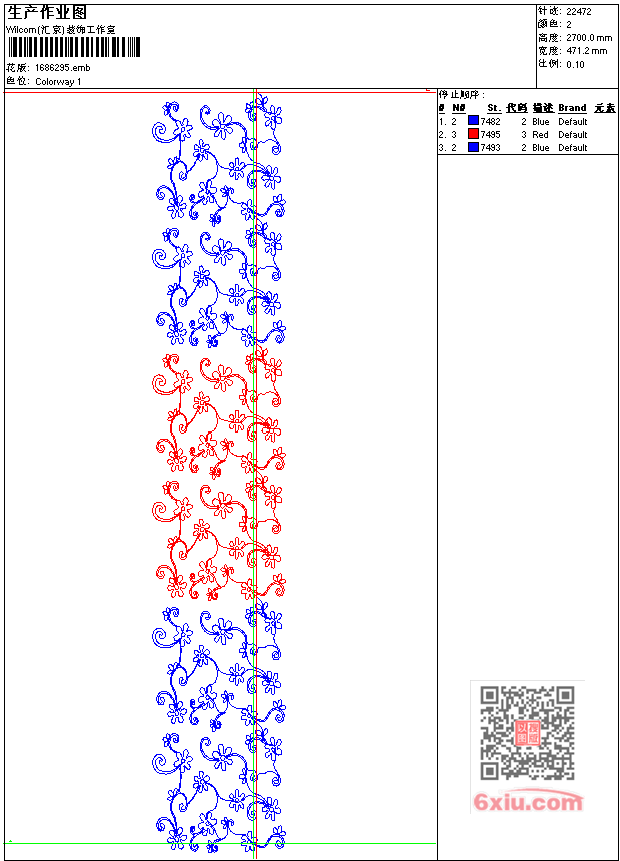 - emb花版参数: 大小:58.00 KB / 尺寸:471*2700[毫米] / 针数:22472针 / 线色:2 / 格式:emb / 版本:7