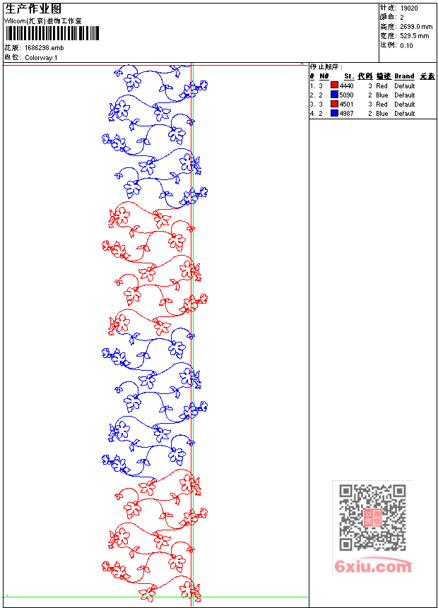 - emb花版参数: 大小:45.50 KB / 尺寸:529*2699[毫米] / 针数:19020针 / 线色:2 / 格式:emb / 版本:7