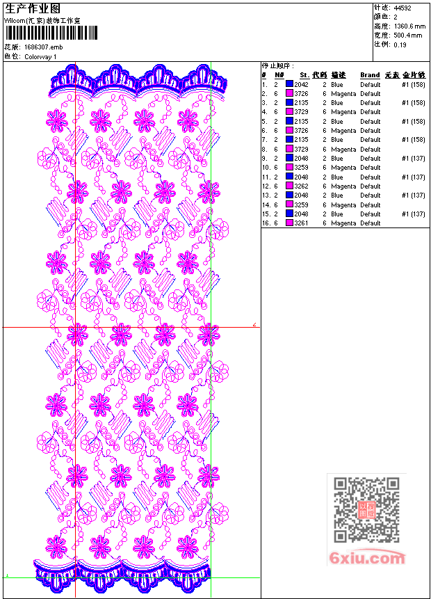 - emb花版参数: 大小:227.00 KB / 尺寸:500*1361[毫米] / 针数:44592针 / 线色:2 / 格式:emb / 版本:7