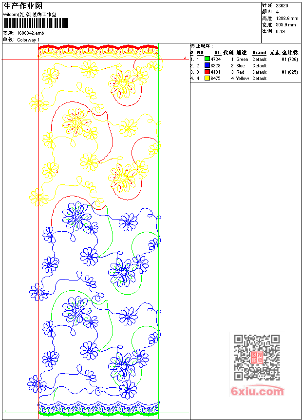 - emb花版参数: 大小:63.50 KB / 尺寸:506*1389[毫米] / 针数:23620针 / 线色:4 / 格式:emb / 版本:7