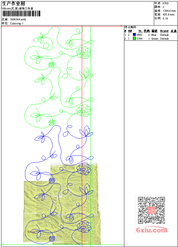 - emb花版参数: 大小:1.51 MB / 尺寸:436*1385[毫米] / 针数:6769针 / 线色:2 / 格式:emb / 版本:7