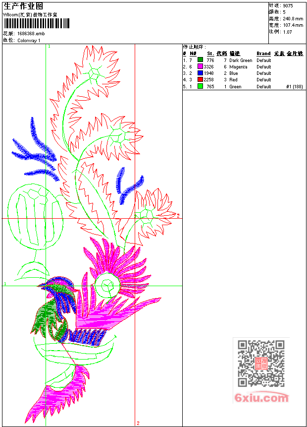 - emb花版参数: 大小:75.00 KB / 尺寸:107*241[毫米] / 针数:9075针 / 线色:5 / 格式:emb / 版本:7