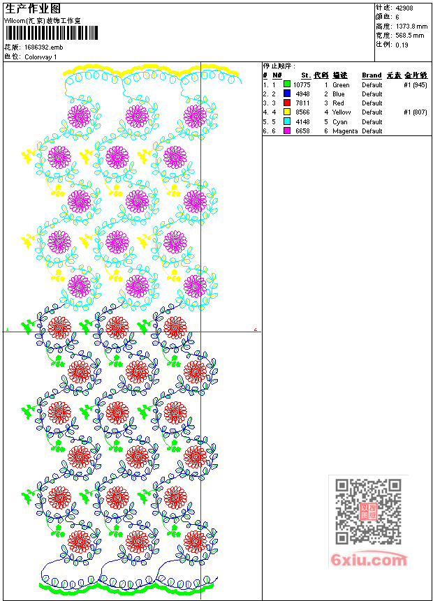 - emb花版参数: 大小:116.00 KB / 尺寸:569*1374[毫米] / 针数:42908针 / 线色:6 / 格式:emb / 版本:7