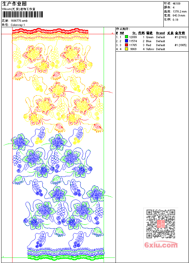 - emb花版参数: 大小:218.50 KB / 尺寸:644*1378[毫米] / 针数:46109针 / 线色:4 / 格式:emb / 版本:7