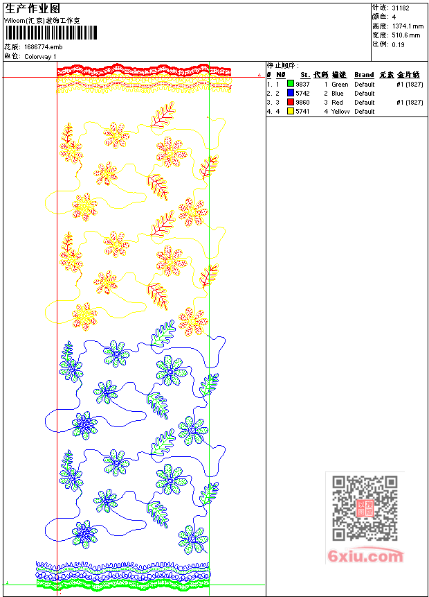 - emb花版参数: 大小:204.50 KB / 尺寸:511*1374[毫米] / 针数:31182针 / 线色:4 / 格式:emb / 版本:7