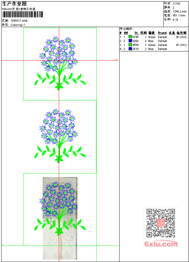 - emb花版参数: 大小:612.00 KB / 尺寸:451*1349[毫米] / 针数:21182针 / 线色:2 / 格式:emb / 版本:7