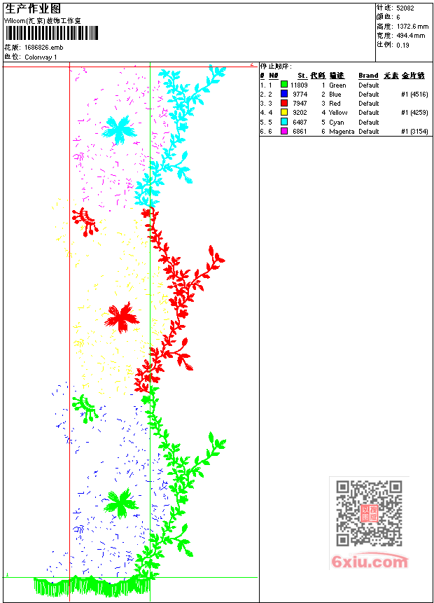 - emb花版参数: 大小:368.50 KB / 尺寸:494*1373[毫米] / 针数:52082针 / 线色:6 / 格式:emb / 版本:7
