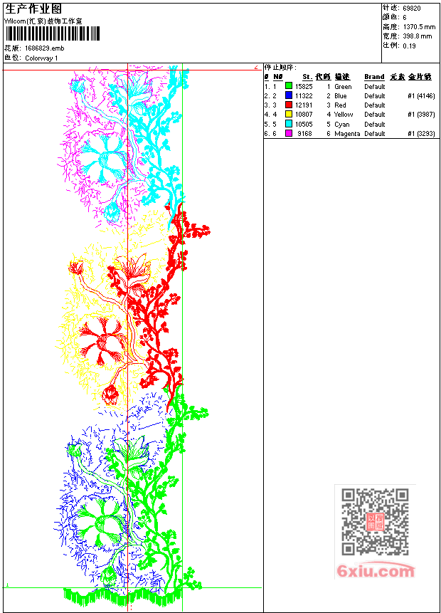 - emb花版参数: 大小:406.50 KB / 尺寸:399*1371[毫米] / 针数:69820针 / 线色:6 / 格式:emb / 版本:7