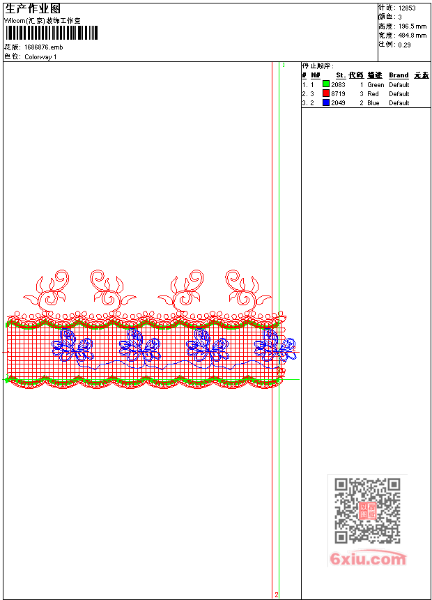 - emb花版参数: 大小:34.00 KB / 尺寸:485*196[毫米] / 针数:12853针 / 线色:3 / 格式:emb / 版本:7
