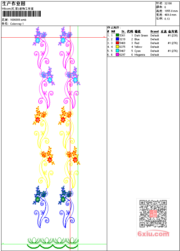 - emb花版参数: 大小:149.50 KB / 尺寸:469*1956[毫米] / 针数:32190针 / 线色:6 / 格式:emb / 版本:8