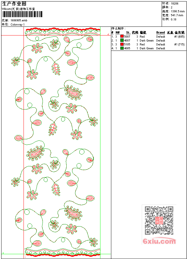 - emb花版参数: 大小:116.50 KB / 尺寸:542*1398[毫米] / 针数:18206针 / 线色:2 / 格式:emb / 版本:8