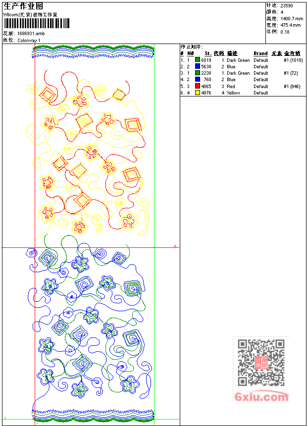 - emb花版参数: 大小:105.00 KB / 尺寸:475*1401[毫米] / 针数:23590针 / 线色:4 / 格式:emb / 版本:9