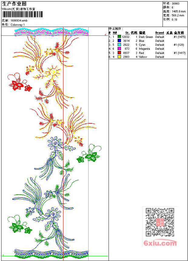 - emb花版参数: 大小:157.50 KB / 尺寸:568*1406[毫米] / 针数:30983针 / 线色:6 / 格式:emb / 版本:9