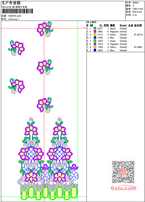 - emb花版参数: 大小:217.00 KB / 尺寸:555*1408[毫米] / 针数:48599针 / 线色:4 / 格式:emb / 版本:7