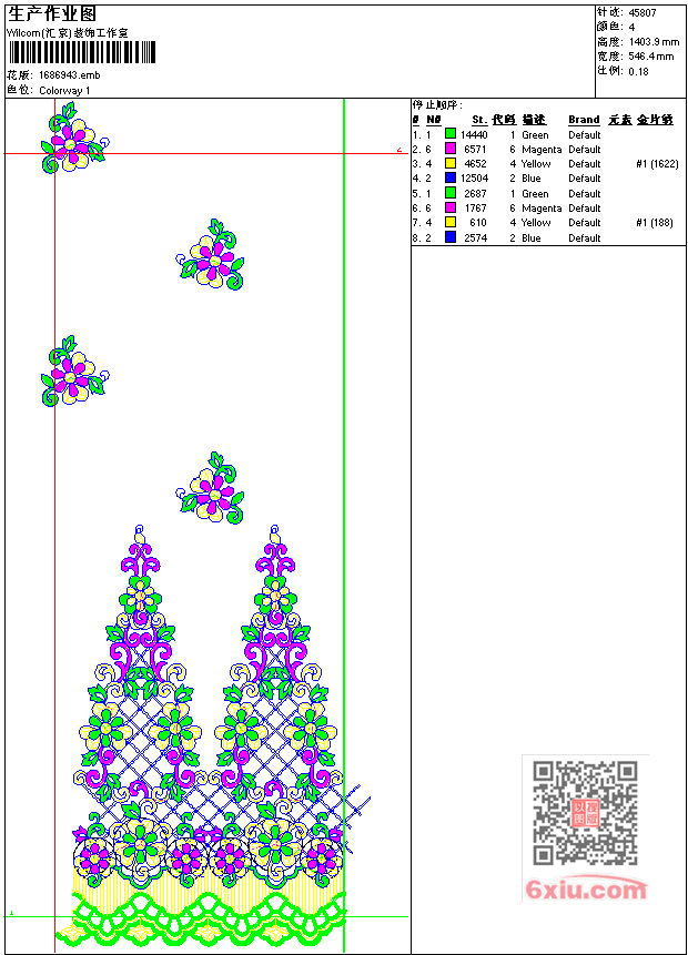 - emb花版参数: 大小:236.00 KB / 尺寸:546*1404[毫米] / 针数:45807针 / 线色:4 / 格式:emb / 版本:7