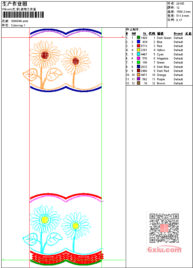 - emb花版参数: 大小:100.00 KB / 尺寸:512*1500[毫米] / 针数:28195针 / 线色:12 / 格式:emb / 版本:8