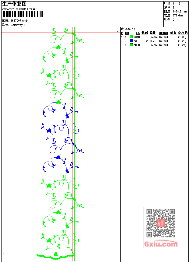- emb花版参数: 大小:112.50 KB / 尺寸:376*1838[毫米] / 针数:18433针 / 线色:2 / 格式:emb / 版本:7