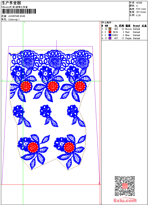 - emb花版参数: 大小:229.50 KB / 尺寸:352*519[毫米] / 针数:43386针 / 线色:4 / 格式:emb / 版本:9