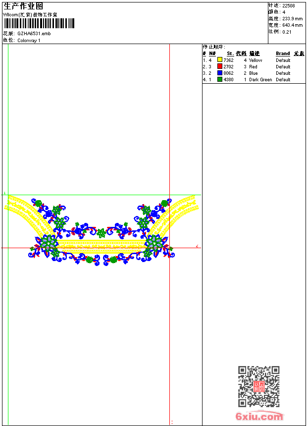 - emb花版参数: 大小:219.00 KB / 尺寸:643*234[毫米] / 针数:22508针 / 线色:4 / 格式:emb / 版本:9