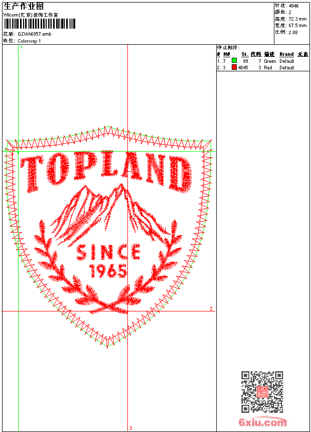 - emb花版参数: 大小:42.50 KB / 尺寸:67*72[毫米] / 针数:4946针 / 线色:2 / 格式:emb / 版本:9