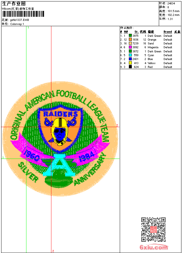 章仔 emb花版参数: 大小:110.50 KB / 尺寸:102*102[毫米] / 针数:24034针 / 线色:8 / 格式:emb / 版本:9 版带文件需绣花软件方可打开,可配色打印导出各种格式或直接上机绣。如无绣花软件可下载1:1模拟效果图。 PNG图片信息:大小:0.3(MB) /图宽*高:387x384(像素) emb下载 1:1图下载 关闭 相关花版: 乱草 骷髅海盗 足球章仔 经典传统牡丹花 简单层次花 国旗皇冠章仔 简单花 包针条横条状领前中花 展翅飞鹰章仔 抽象玫瑰花领 叶子小花朵 兰花腰带 圆圈车轮状下摆 章仔 网布花边 字母小狗 传统牡丹花 曲线字母单针包边 字母贴男 锚简单花 抽象它它米 曲线稀梳包针前幅中 蝴蝶 抽象牡丹花 传统插针花裙边摆条 字母 女孩 鞋沙滩 帽 简单小花