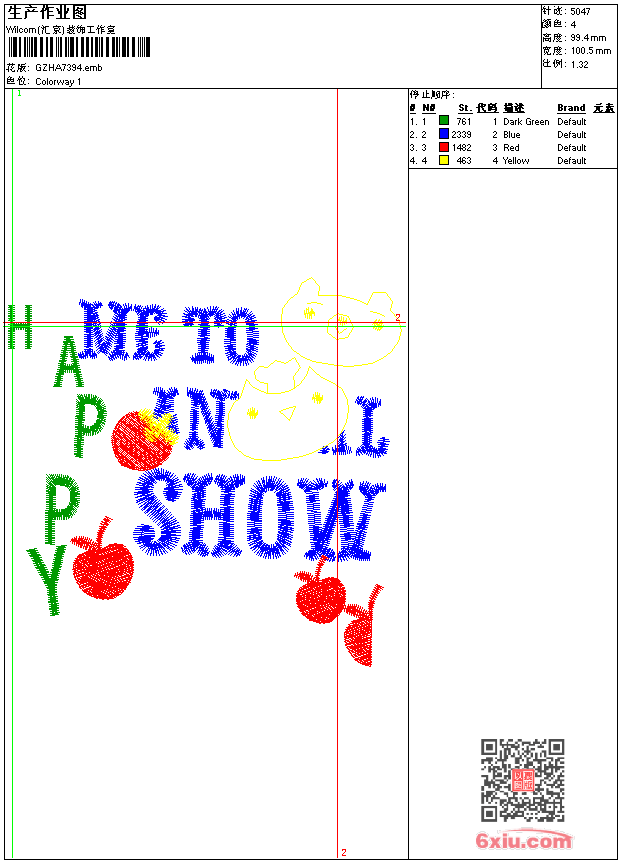 字母草莓 emb花版参数: 大小:45.50 KB / 尺寸:101*99[毫米] / 针数:5047针 / 线色:4 / 格式:emb / 版本:9 版带文件需绣花软件方可打开,可配色打印导出各种格式或直接上机绣。如无绣花软件可下载1:1模拟效果图。 PNG图片信息:大小:0.1(MB) /图宽*高:381x377(像素) emb下载 1:1图下载 关闭 相关花版: 皇冠 孔雀开屏 三角针 经典花 贴布字母鹰 米字单针 戴眼镜大嘴巴骷髅 字母 后袋字母 章仔 章仔 章仔 章仔 YES 抽象葫芦 章仔 锚 骑马章仔 骑马章仔 章仔 章仔 字母 高帽 ZAP字母 骷髅 狮子章仔 女神 章仔 classic 字母