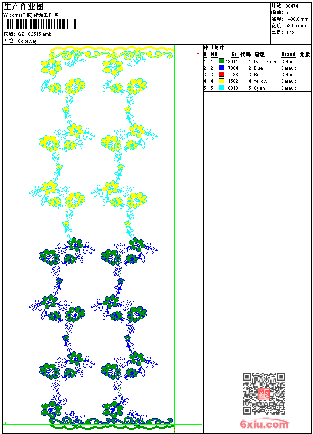 窗帘 emb花版参数: 大小:141.00 KB / 尺寸:531*1400[毫米] / 针数:38474针 / 线色:5 / 格式:emb / 版本:9 版带文件需绣花软件方可打开,可配色打印导出各种格式或直接上机绣。如无绣花软件可下载1:1模拟效果图。 PNG图片信息:大小:3.0(MB) /图宽*高:2007x5296(像素) emb下载 1:1图下载 关闭 相关花版: 经典花 水溶领 窗帘 水溶领 水溶朵花 锚章仔 绳绣花 匹绣 抽象曲线边 窗帘 抽象衣前中 窗帘 裤花 亮片 窗帘 窗帘 单边衣襟 几何裙摆 亮片 窗帘 水深朵花 窗帘 水深朵花 U领前中童 童花 后背假领 传统领 水深朵花 多色水溶领 镂空裙摆条 多色水溶领 窗帘