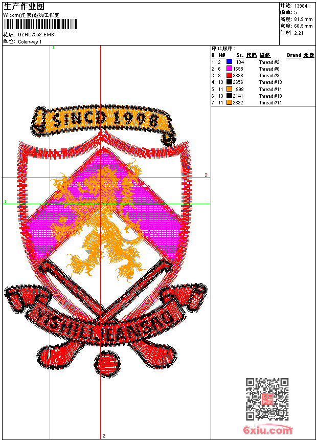 狮标 emb花版参数: 大小:952.00 KB / 尺寸:61*82[毫米] / 针数:13984针 / 线色:5 / 格式:emb / 版本:7 版带文件需绣花软件方可打开,可配色打印导出各种格式或直接上机绣。如无绣花软件可下载1:1模拟效果图。 PNG图片信息:大小:0.1(MB) /图宽*高:231x310(像素) emb下载 1:1图下载 关闭 相关花版: 裙裤摆 卡通童 裙曲线 裤花蝴蝶 简洁花 衣领 亮片 珠片条 裤袋 章 衣领胸 衣领胸 人物卡通 衣花 熊裤袋 骷髅标 衣领 裙腰花 裤袋 胸花 水溶其它后背 亮片 曲线条 几何五角星 蝴蝶 猫 小鸟 链条针玫瑰花 豹动物 裙衣摆条 衣领胸 童花蝴蝶贴布