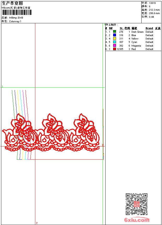 - emb花版参数: 大小:3.55 MB / 尺寸:300*212[毫米] / 针数:13819针 / 线色:6 / 格式:emb / 版本:2006