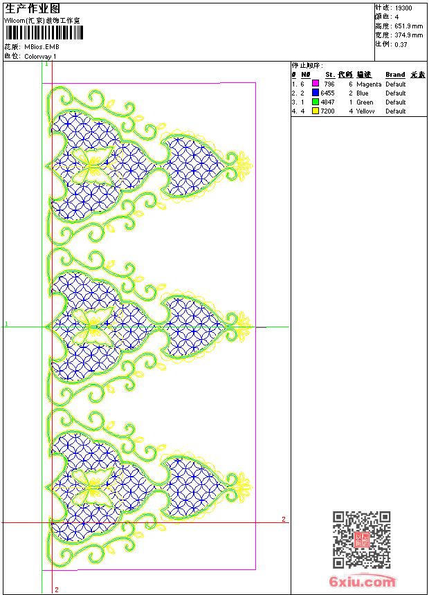 - emb花版参数: 大小:64.50 KB / 尺寸:375*652[毫米] / 针数:19300针 / 线色:4 / 格式:emb / 版本:7