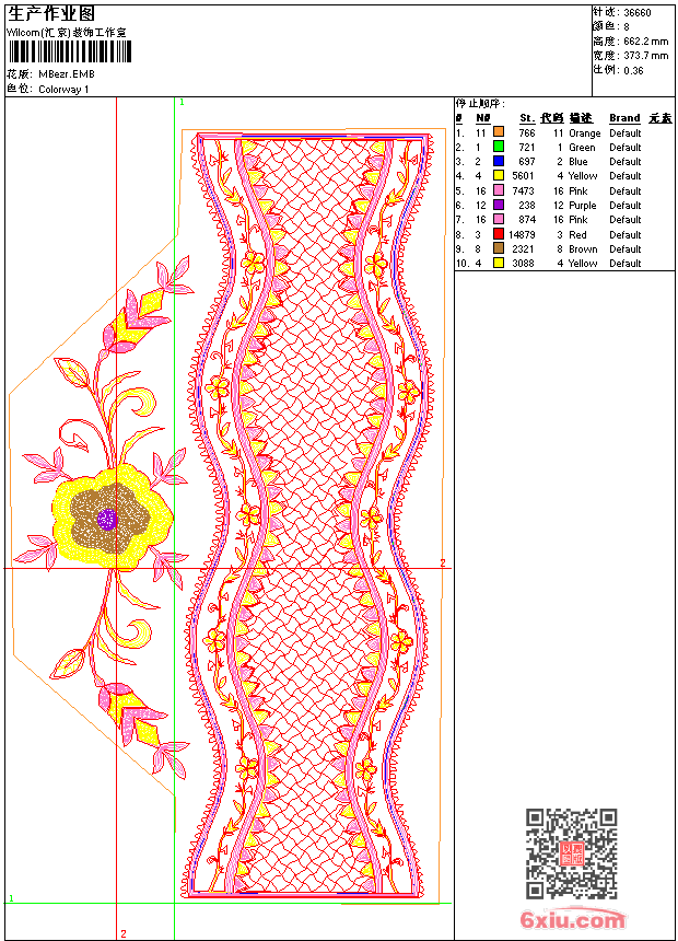 衣花 emb花版参数: 大小:200.50 KB / 尺寸:374*662[毫米] / 针数:36660针 / 线色:8 / 格式:emb / 版本:7 版带文件需绣花软件方可打开,可配色打印导出各种格式或直接上机绣。如无绣花软件可下载1:1模拟效果图。 PNG图片信息:大小:2.0(MB) /图宽*高:1414x2505(像素) emb下载 1:1图下载 收藏本图 关闭 相关花版: 水溶领 裤角花 装饰方形 女孩人物 章仔 亮片 骷髅珠片 假领 衣花 衣领 衣摆曲线 曲线衣角 花贴布 三角针花 羊贴布 熊贴布 兔女郎 花中老年 亮片 五星裤袋 亮片 珠片贴布花 裤袋 简单花 亮片 珠片曲线 条码曲线 亮片 珠片kappa 装饰曲线 衣领 满绣衣 家纺曲线 衣领 装饰环