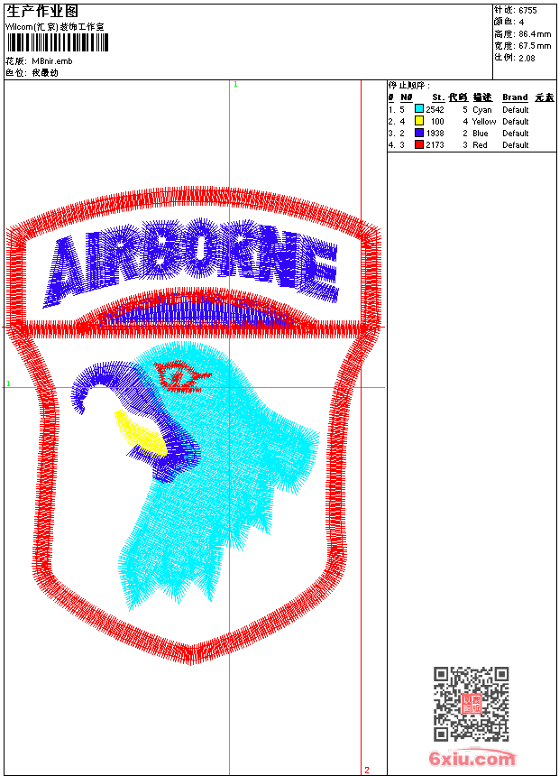 老鹰徽章标志 emb花版参数: 大小:49.00 KB / 尺寸:68*86[毫米] / 针数:6755针 / 线色:4 / 格式:emb / 版本:9 版带文件需绣花软件方可打开,可配色打印导出各种格式或直接上机绣。如无绣花软件可下载1:1模拟效果图。 PNG图片信息:大小:0.1(MB) /图宽*高:256x327(像素) emb下载 1:1图下载 关闭 相关花版: 条码 徽章标志武士剑 线条花朵 骑马章仔男保罗polo 奥特曼卡通 童装裙子 卡通变色龙蜥蜴 胸前漂亮的花朵 亮片 蝴蝶珠片裤子 童装字母 sweet 亮片 珠片简单花 窗帘 匹绣 狮子男章标 亮片 珠片裤子花 老鹰卡通章仔 简单线条 简单花朵 餐巾台布花环圆 曲线 亮片 珠片金片兔子 足球字母章仔 简单的花朵 人物美女字母 抽象前复曲线 领子 漂亮的花朵 裙子的边摆 亮片 珠片卡通小孩 简单花朵