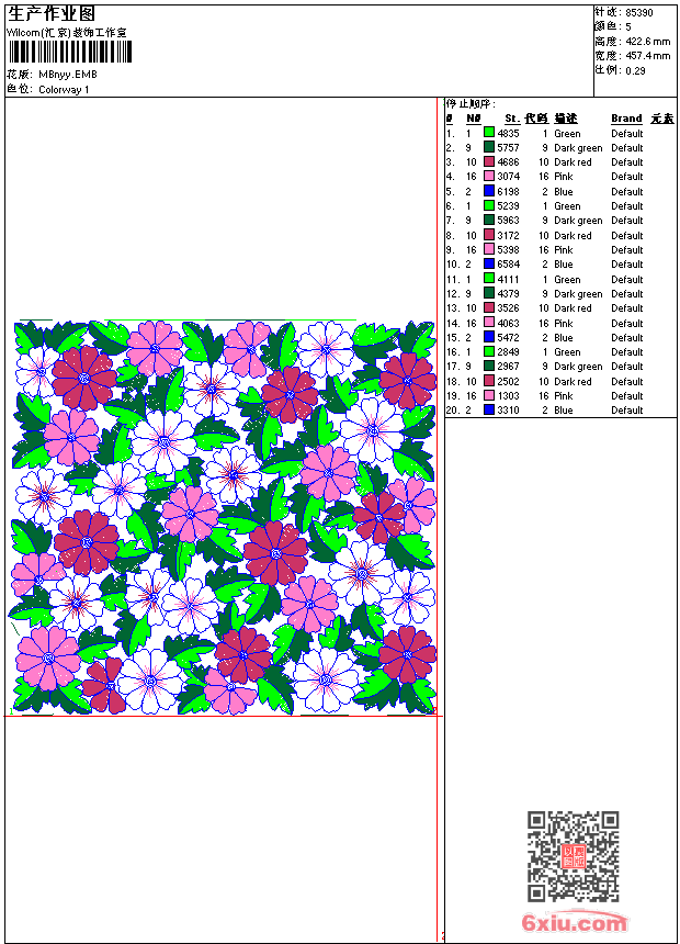 漂亮的花朵方形满绣装饰 emb花版参数: 大小:461.50 KB / 尺寸:457*423[毫米] / 针数:85390针 / 线色:5 / 格式:emb / 版本:7 版带文件需绣花软件方可打开,可配色打印导出各种格式或直接上机绣。如无绣花软件可下载1:1模拟效果图。 PNG图片信息:大小:4.3(MB) /图宽*高:1731x1599(像素) emb下载 1:1图下载 关闭 相关花版: 兔子 中国风传统吉祥几何 条码 亮片 珠片面具皇冠 简单的童装花朵 男孩女孩卡通 猴子贴布 苹果贴布 卡通狗 珠片蝴蝶 中国吉祥的圆圈 兔子卡通 宠物狗柯基 亮片 珠片蝴蝶裤子 藤状的花朵雕孔 对称花 翅膀插针 几何形状 裙子的摆 绳绣领子 领子 简单线条 简单花朵 领子 条码 衣领 男符号章仔 地毯台布复杂 亮片 条码 绳子绣花