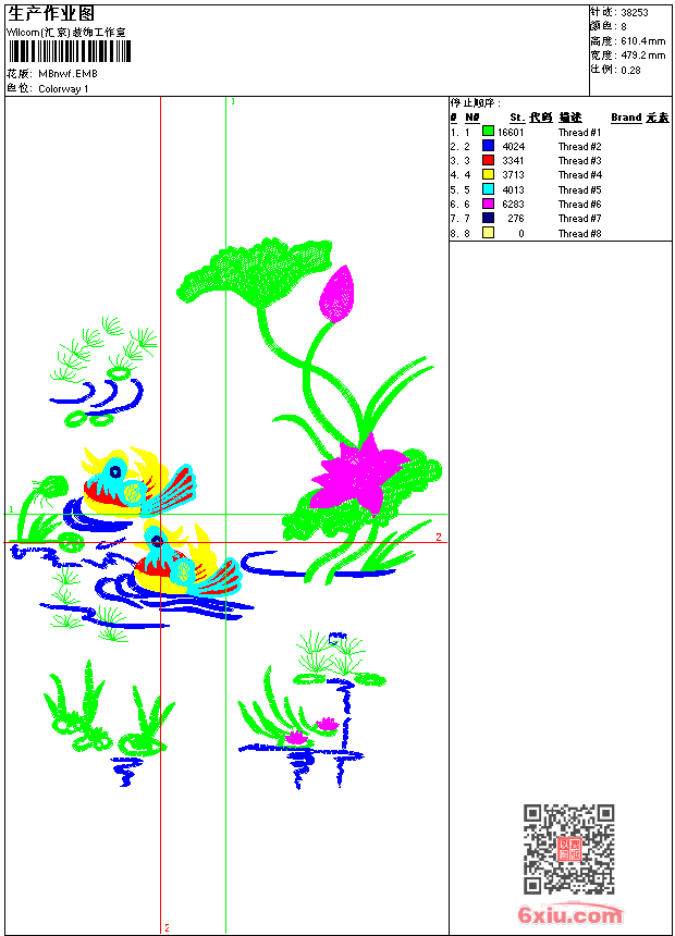 荷花鸳鸯中国风 emb花版参数: 大小:143.00 KB / 尺寸:479*610[毫米] / 针数:38253针 / 线色:8 / 格式:emb / 版本:7 版带文件需绣花软件方可打开,可配色打印导出各种格式或直接上机绣。如无绣花软件可下载1:1模拟效果图。 PNG图片信息:大小:2.0(MB) /图宽*高:1813x2309(像素) emb下载 1:1图下载 关闭 相关花版: 衣领 三角形的花朵 衣领 卡通熊 条码 衣领 衣领 亮片 亮片樱桃 漂亮的牡丹花 四个对称方向的方形 有翅膀的狮子 条码 漂亮的花朵 简单花 简单花 卡通熊贴布 吉祥的圆圈 卡通贴布大象 弯的条码 弯的条码 卡通动物 蝙蝠侠卡通 狗snoopy 条码 米老鼠 亮片 亮片小花朵 漂亮的花朵 衣领 多色水溶领 线条