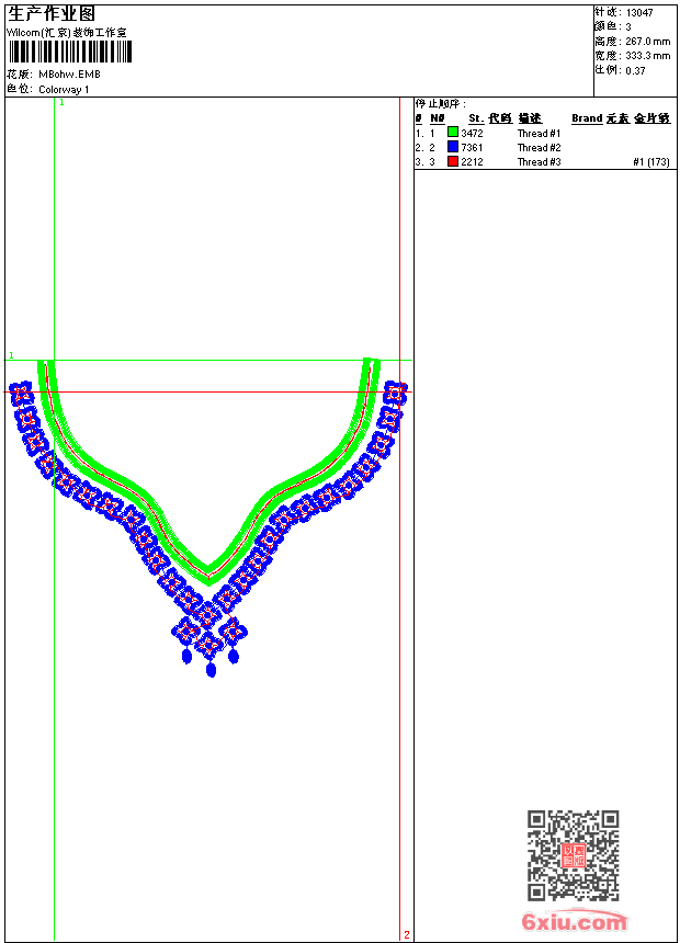 亮片 衣领 emb花版参数: 大小:73.00 KB / 尺寸:333*267[毫米] / 针数:13047针 / 线色:3 / 格式:emb / 版本:9 版带文件需绣花软件方可打开,可配色打印导出各种格式或直接上机绣。如无绣花软件可下载1:1模拟效果图。 PNG图片信息:大小:0.6(MB) /图宽*高:1261x1010(像素) emb下载 1:1图下载 关闭 相关花版: 鞋子花 匹绣 漂亮的花朵 横条 抽象的花朵 线条花朵 简单花朵 花瓶 水草一样的郁金香 台布地毯 衣领 横条 米老鼠 猫咪 裙摆 天线宝宝 古代的马车 漂亮抽象的花朵 横条 简单花朵 几何图案 线条衣领 藤条 竖条 卡通熊贴足球 卡通熊开汽车 竖条 中国风龙吉祥 简单小花 抽象的圆圈