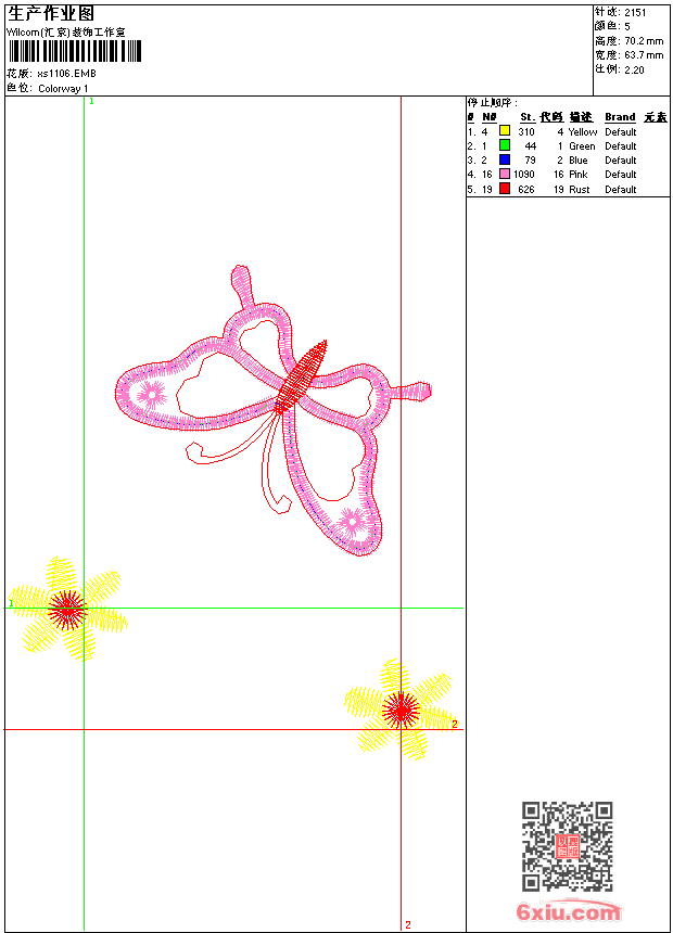 - emb花版参数: 大小:33.50 KB / 尺寸:64*70[毫米] / 针数:2151针 / 线色:5 / 格式:emb / 版本:9