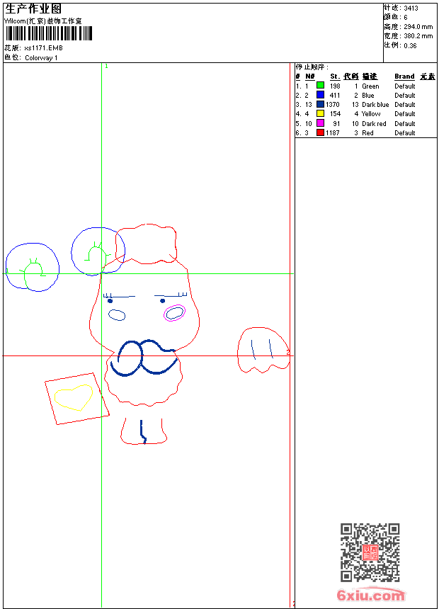 - emb花版参数: 大小:32.50 KB / 尺寸:380*294[毫米] / 针数:3413针 / 线色:6 / 格式:emb / 版本:9