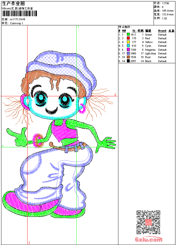 - emb花版参数: 大小:95.00 KB / 尺寸:134*195[毫米] / 针数:11796针 / 线色:8 / 格式:emb / 版本:9