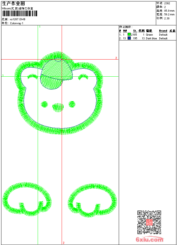 - emb花版参数: 大小:30.00 KB / 尺寸:59*86[毫米] / 针数:2382针 / 线色:2 / 格式:emb / 版本:9