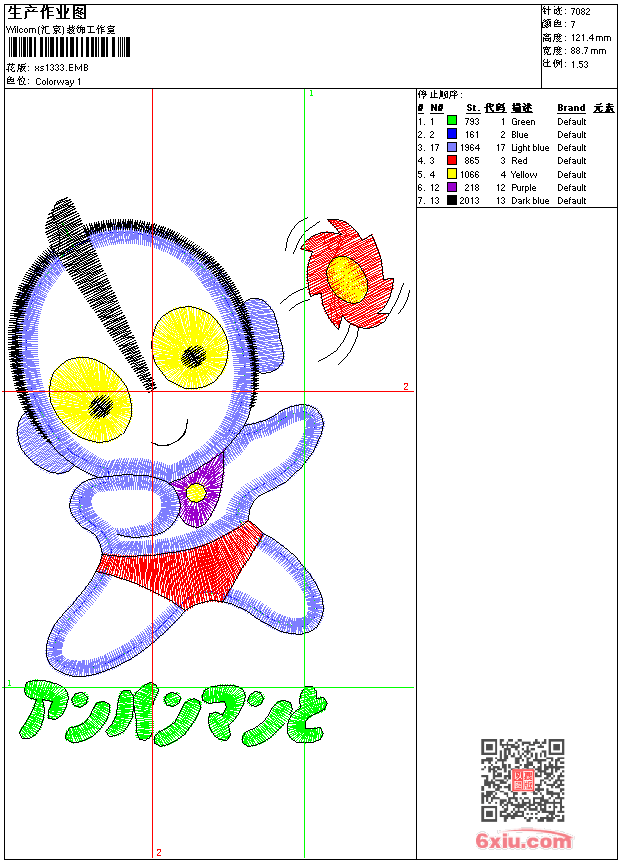 - emb花版参数: 大小:56.00 KB / 尺寸:89*121[毫米] / 针数:7082针 / 线色:7 / 格式:emb / 版本:9