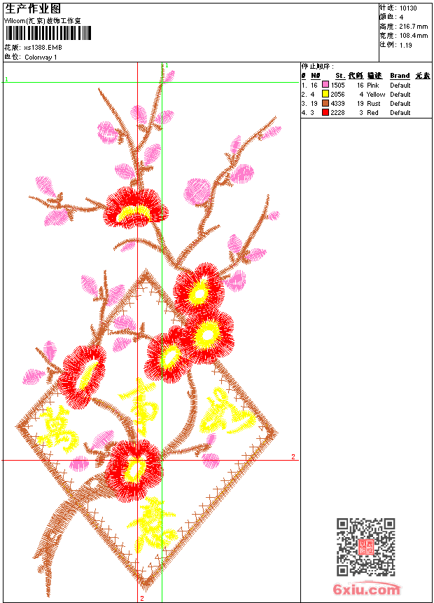 - emb花版参数: 大小:77.50 KB / 尺寸:108*217[毫米] / 针数:10130针 / 线色:4 / 格式:emb / 版本:9