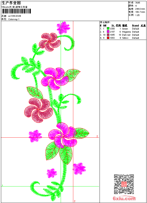 - emb花版参数: 大小:59.00 KB / 尺寸:107*245[毫米] / 针数:7695针 / 线色:4 / 格式:emb / 版本:9
