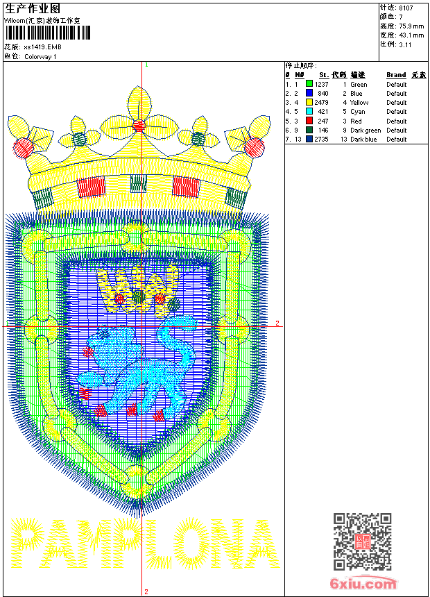 - emb花版参数: 大小:63.00 KB / 尺寸:43*76[毫米] / 针数:8107针 / 线色:7 / 格式:emb / 版本:9