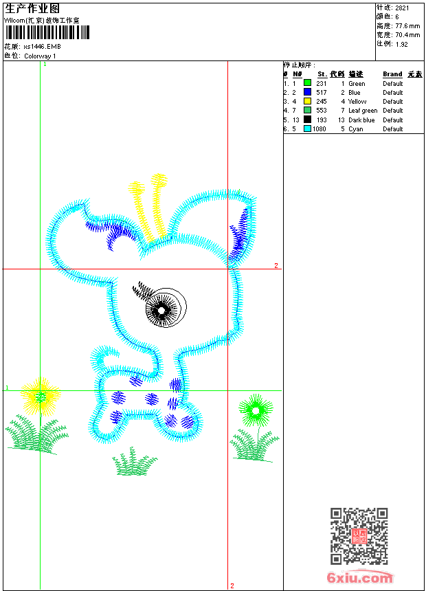 - emb花版参数: 大小:41.50 KB / 尺寸:70*78[毫米] / 针数:2821针 / 线色:6 / 格式:emb / 版本:9