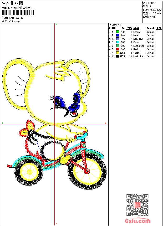 - emb花版参数: 大小:83.00 KB / 尺寸:122*154[毫米] / 针数:9872针 / 线色:8 / 格式:emb / 版本:9
