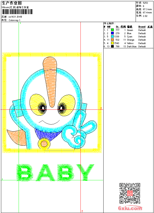 - emb花版参数: 大小:42.50 KB / 尺寸:67*87[毫米] / 针数:5249针 / 线色:6 / 格式:emb / 版本:9