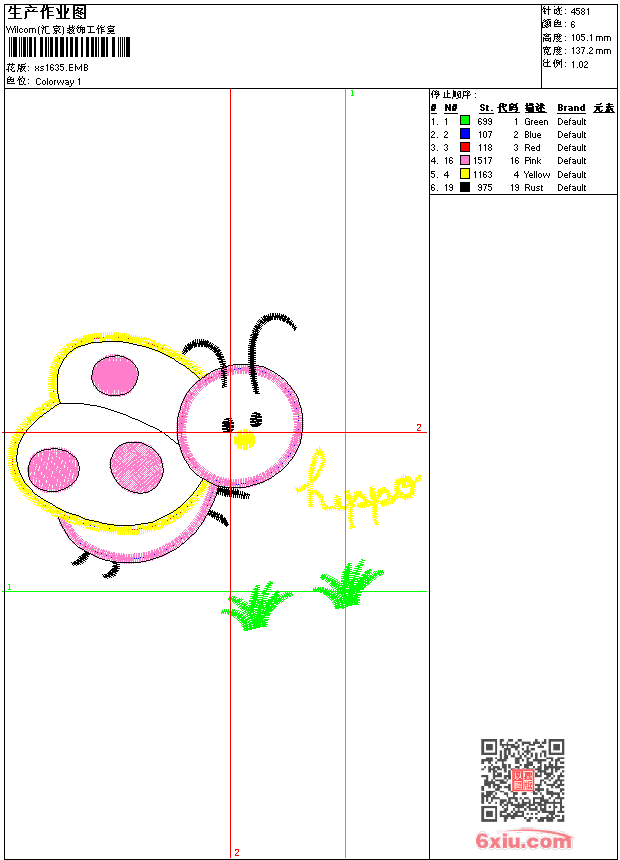 - emb花版参数: 大小:45.00 KB / 尺寸:137*105[毫米] / 针数:4581针 / 线色:6 / 格式:emb / 版本:9