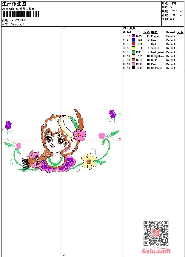 - emb花版参数: 大小:89.50 KB / 尺寸:189*102[毫米] / 针数:8959针 / 线色:9 / 格式:emb / 版本:9