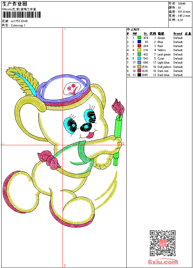 - emb花版参数: 大小:86.50 KB / 尺寸:145*192[毫米] / 针数:10949针 / 线色:10 / 格式:emb / 版本:9